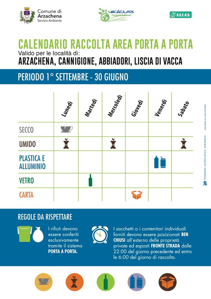 Arzachena, 4 settembre 2019 -L'amministrazione comunale di Arzachena rende noto che1° settembre il calendario del ritiro rifiuti e riciclabili “porta a porta” ha ripreso i suoi consueti turni.