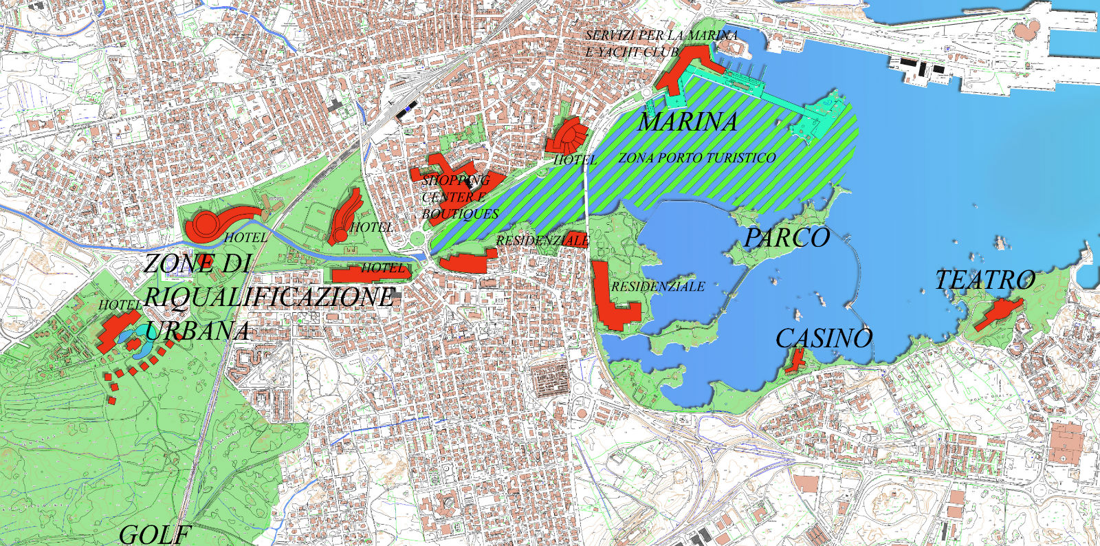 Nelle carte in nostro possesso, in cui si legge la dicitura “Arch. Gianni Gamondi”, vengono individuate le aree di intervento e le infrastrutture che potrebbero un giorno essere realizzate: cinque alberghi (tre sul Rio Seligheddu, uno sul mare e uno nel campo da golf “urbano” che parte a Tannaule e arriva alla Olbia-Sassari), uno shopping center in via Redipuglia, tre centri residenziali sul mare (precisamente sponda sud del golfo interno), un casinò al posto dell’ex Alberghiero e un grande teatro in “zona” Michelucci.