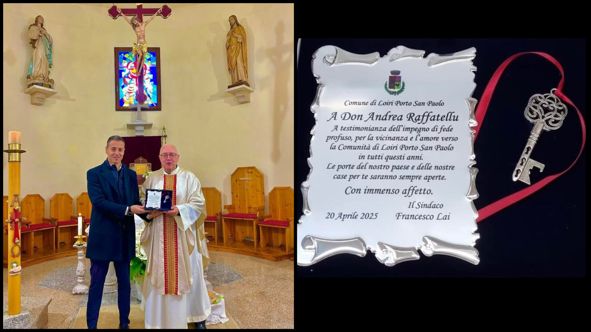 Una cerimonia molto sentita e partecipata quella che si è svolta nell'omonima chiesa alla presenza del primo cittadino Francesco Lai che ha dedicato questo pensiero alla loro guida spirituale: "Sono stati anni intensi, carichi di altruismo e di vicinanza alla nostra comunità, per questo abbiamo consegnato a Don Andrea 𝐥𝐞 𝐜𝐡𝐢𝐚𝐯𝐢 della nostra comunità, a dimostrazione che le porte delle nostre case e della casa comunale per lui saranno sempre aperte, e proporremo in Consiglio Comunale il riconoscimento della 𝐜𝐢𝐭𝐭𝐚𝐝𝐢𝐧𝐚𝐧𝐳𝐚 𝐨𝐧𝐨𝐫𝐚𝐫𝐢𝐚".