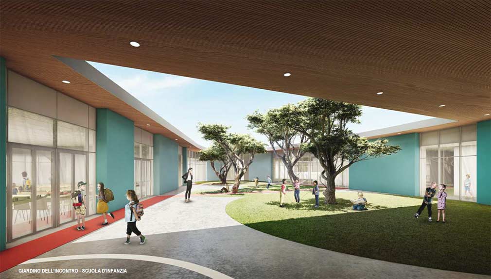 "Da un punto di vista distributivo e compositivo la nuova scuola presenterà un’impostazione planimetrica continua e compatta, intervallata da due grandi spazi verdi ad uso esclusivo della didattica, intorno alle quali si sviluppa la distribuzione che organizza tutti gli ambienti principali. Le due scuole, possono entrare in connessione con estrema facilità in base alle esigenze. L’inserimento di pareti manovrabili in ambienti come refettorio, biblioteca insegnanti e spazi interciclo, consente la creazione di spazi didattici flessibili pronti ad accogliere gruppi più o meno numerosi", continua il documento.