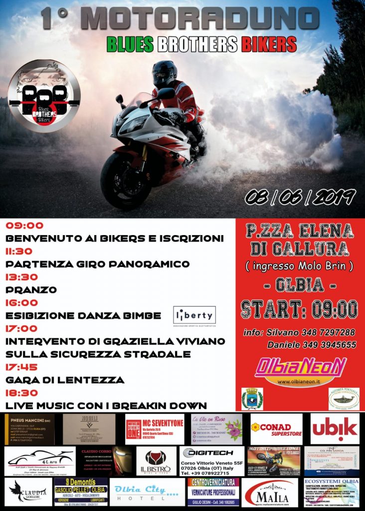 Il prossimo 8 giugno in piazza Elena di Gallura, ingresso molo Brin, si terrà una giornata all'insegna dei motori. Gli amanti delle due ruote si daranno appuntamento per questo motoraduno organizzato dal motoclub cittadino "Blues Brothers Bike".